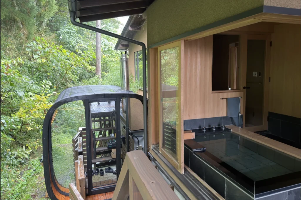 HUB SAUNA株式会社は、静岡県熱海市にある別荘に、Leil®️ Saunasのサウナ小屋「Round Cube Mini」を導入いたしました。 建物の裏庭に設けられたデッキに設置されたこのサウナは、目の前に広がる大自然を独り占めできる特別なプライベート空間です。屋内のお風呂(浴室スペース)ともスムーズに行き来できる動線になっており、薪ストーブの柔らかな熱で芯まで温まりながら、極上の癒やし体験を満喫していただけます。